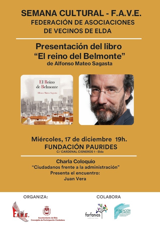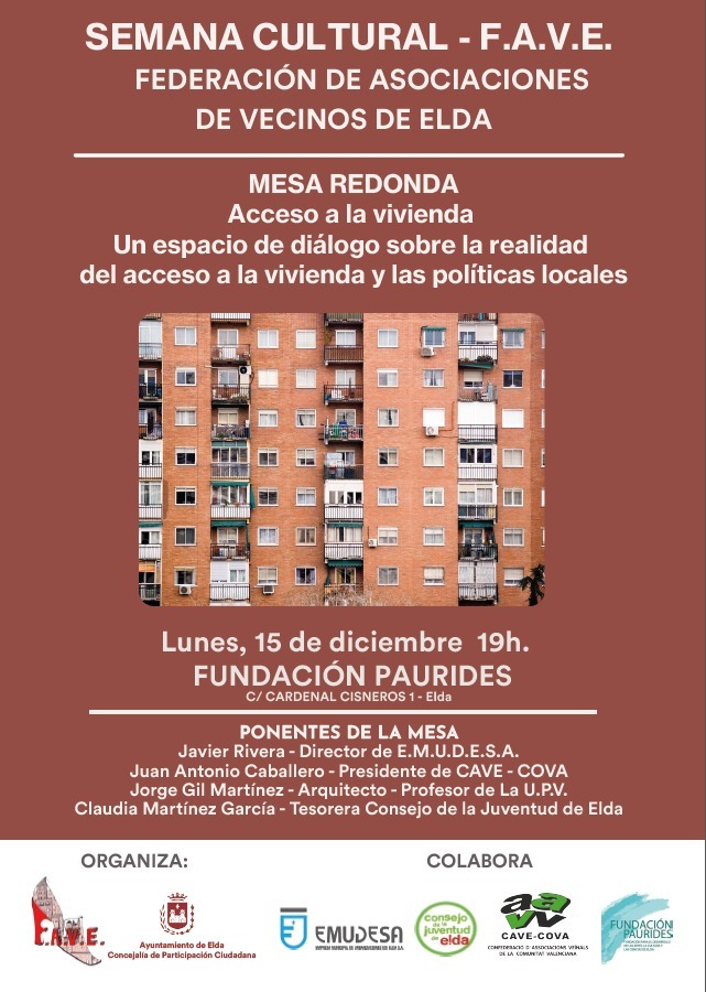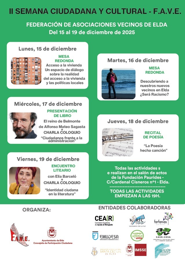 La Federación de Asociaciones de Vecinos de Elda (FAVE), en colaboración con la concejalía de Participación Ciudadana, organiza del 15 al 19 de diciembre la II Semana Ciudadana y Cultural, un ciclo de actividades destinadas a promover la participación vecinal, la reflexión colectiva y el disfrute cultural en la ciudad.