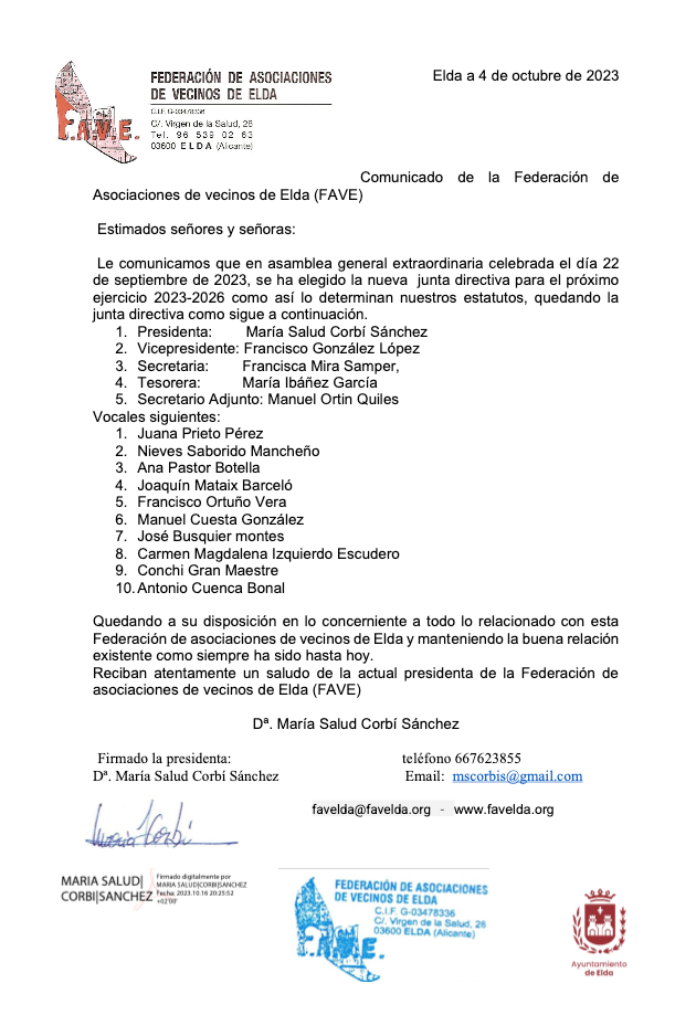 Reciban atentamente un saludo de la actual presidenta de la Federación de asociaciones de vecinos de Elda (FAVE).